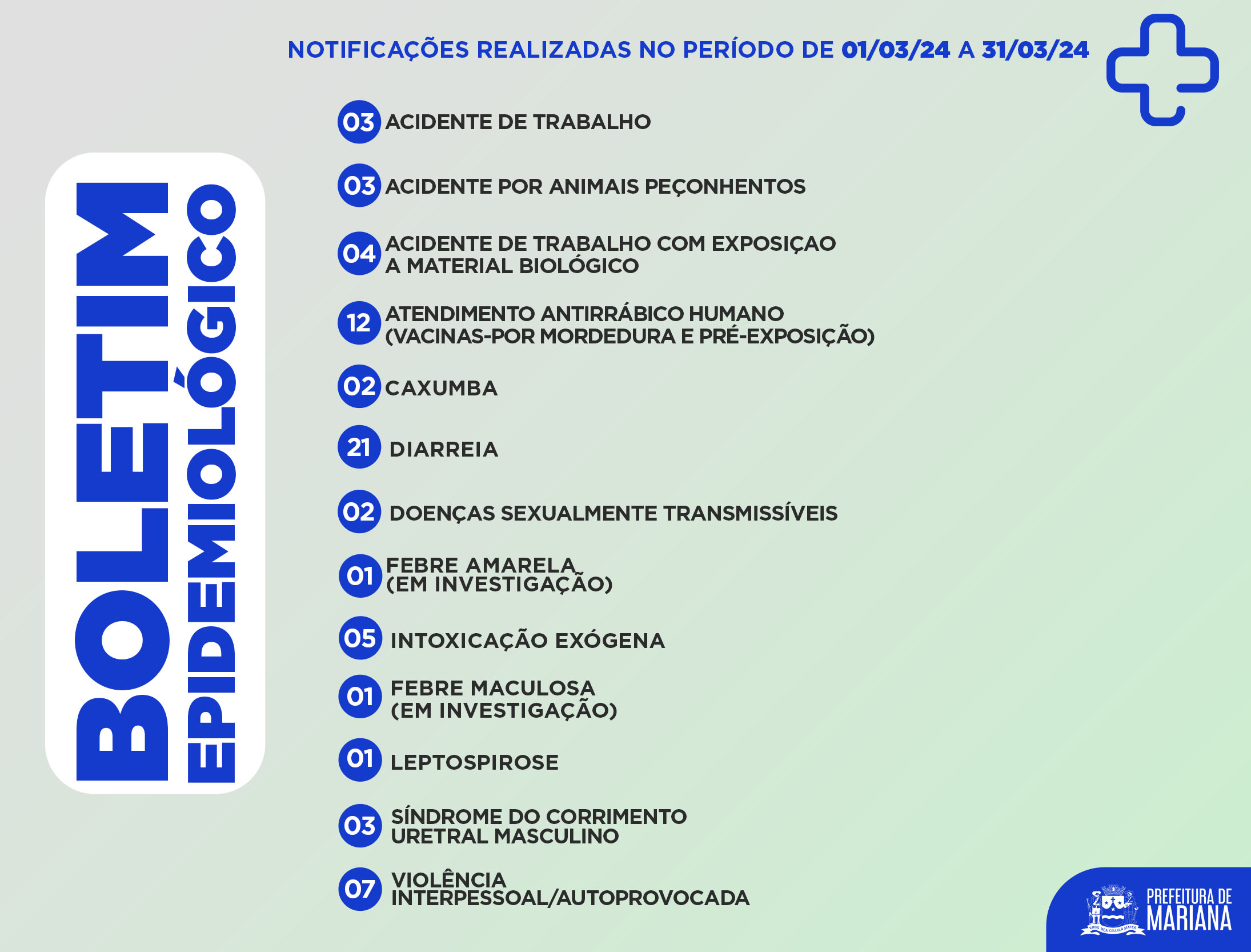 A Prefeitura de Mariana, por meio da Secretaria de Saúde, divulga o Boletim Epidemiológico referente aos casos de dengue, zika e chikungunya, transmitido pelo mosquito Aedes aegypti, e Covid-19, registrados até segunda-feira (27).