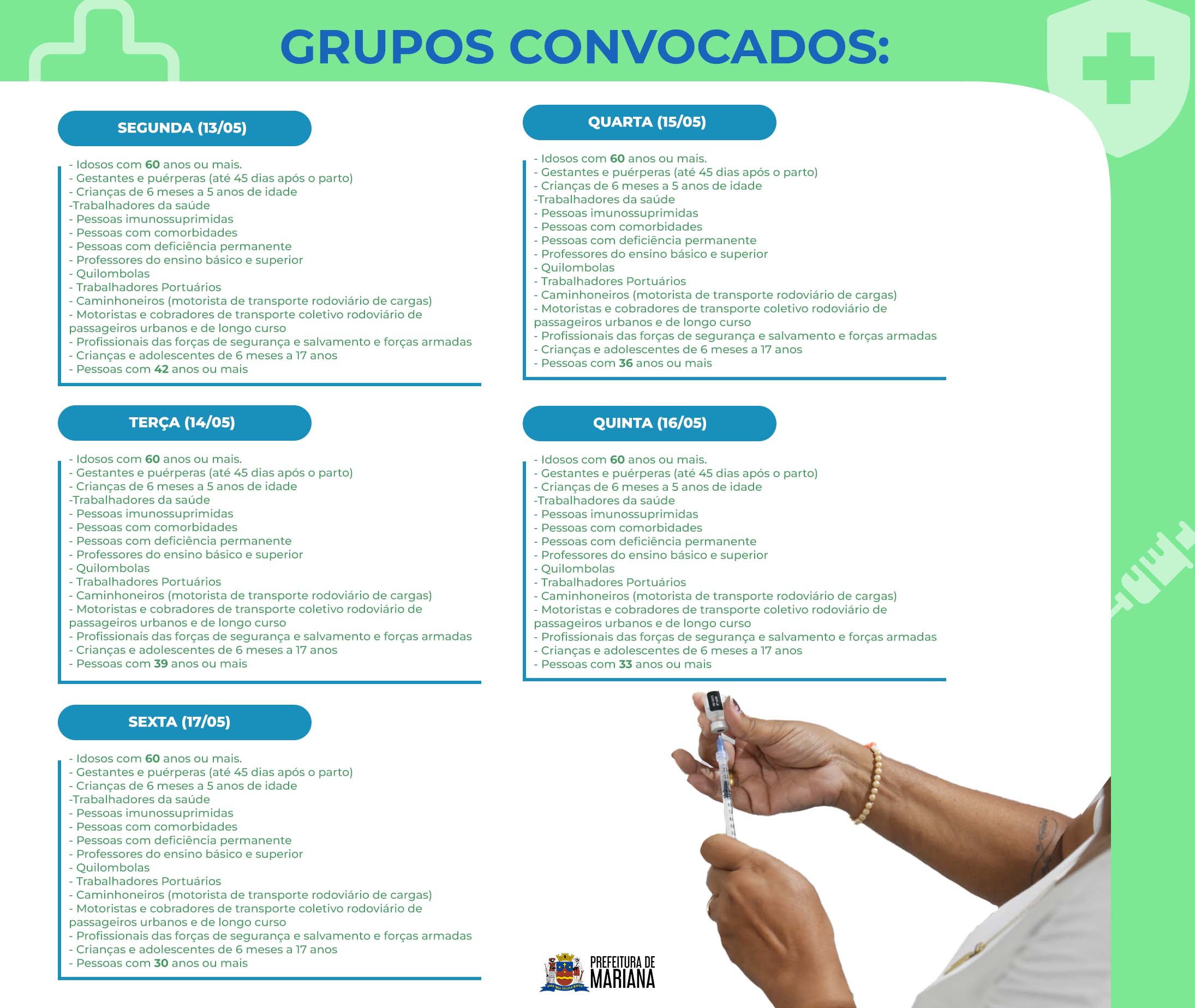 A Prefeitura de Mariana, através da Secretaria de Saúde, divulga o cronograma de vacinação contra a Influenza desta semana. Para garantir a eficácia da vacinação, os membros dos grupos prioritários devem comparecer ao local indicado, munidos de documento oficial com foto e comprovante de residência. Esteja atento à data agendada e siga os canais oficiais de informação da Prefeitura de Mariana.