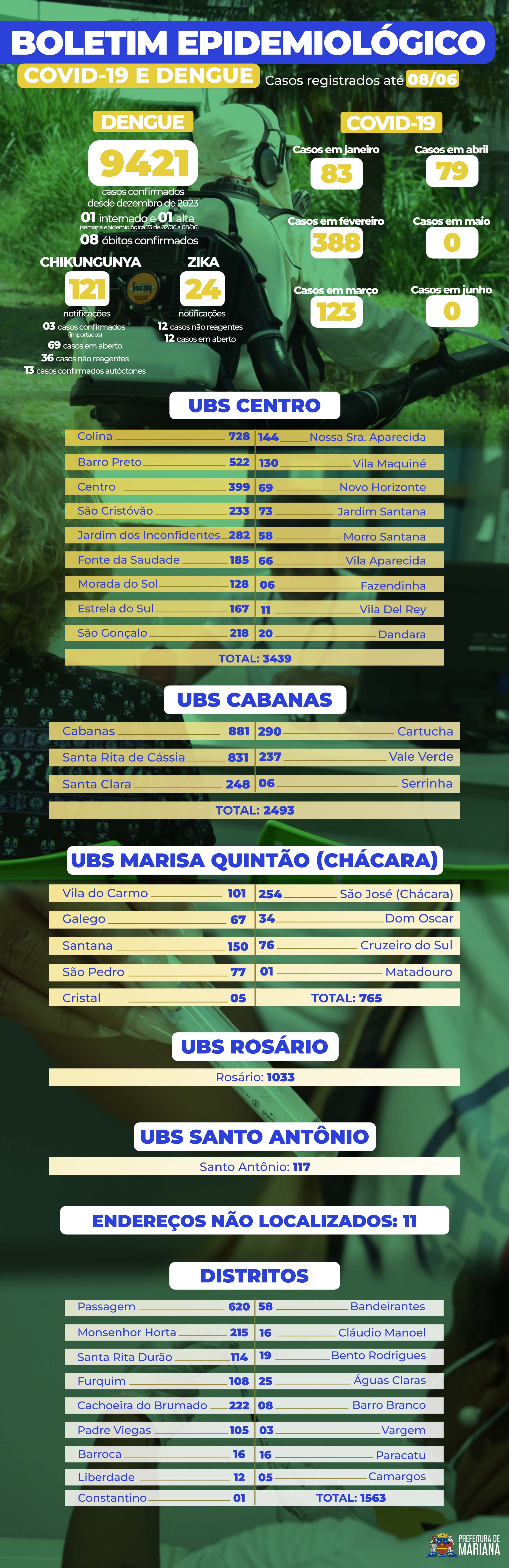 A Prefeitura de Mariana, por meio da Secretaria de Saúde, divulga o Boletim Epidemiológico com informações sobre os casos de dengue, zika, chikungunya (transmitidos pelo mosquito Aedes aegypti) e Covid-19. Os dados abrangem o período até sábado, 08 de junho.