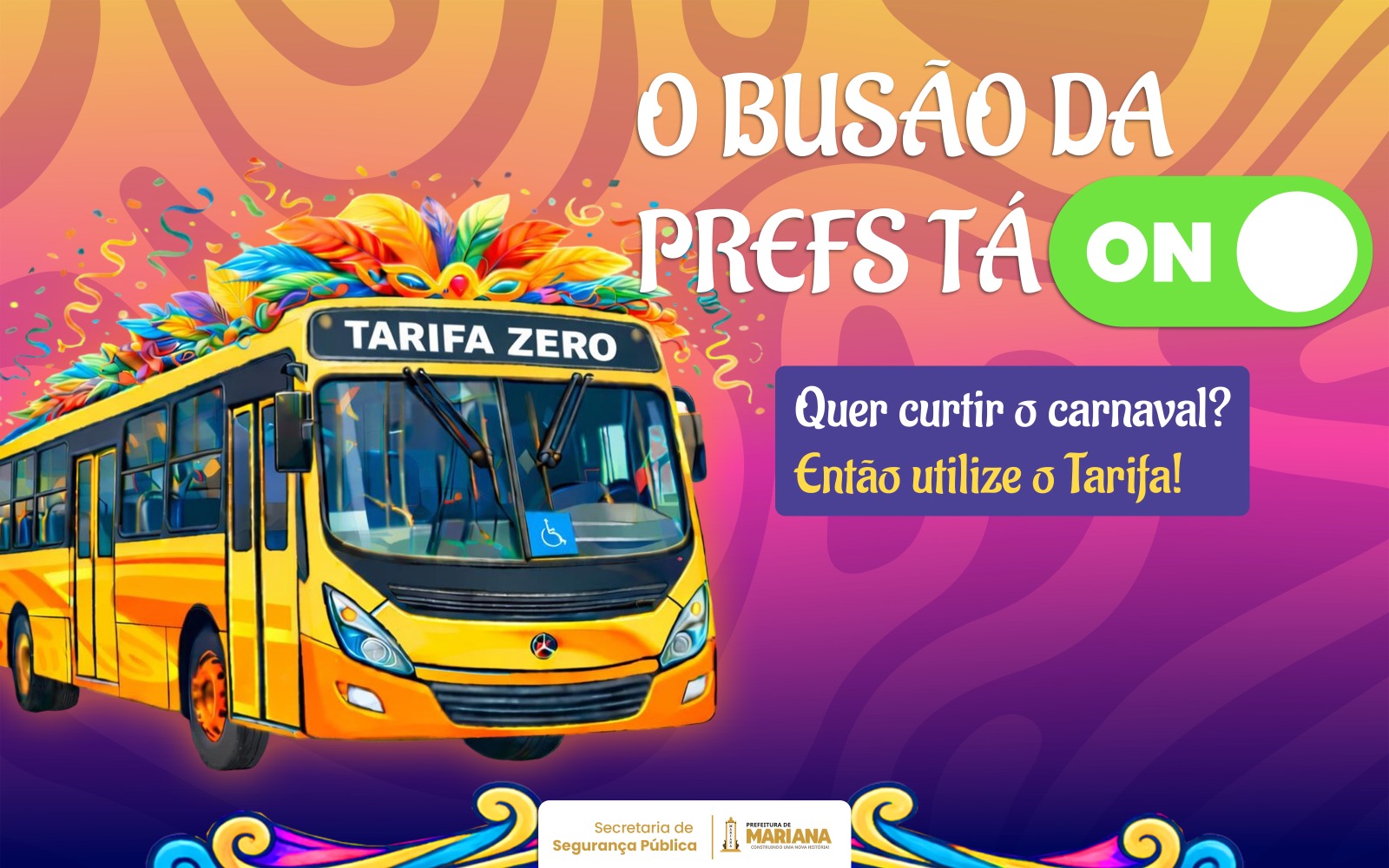 Tem Tarifa Zero também no Carnaval! A Prefeitura de Mariana, por meio da Secretaria de Segurança Pública, informa a ampliação dos horários do transporte coletivo gratuito durante os dias de festa.